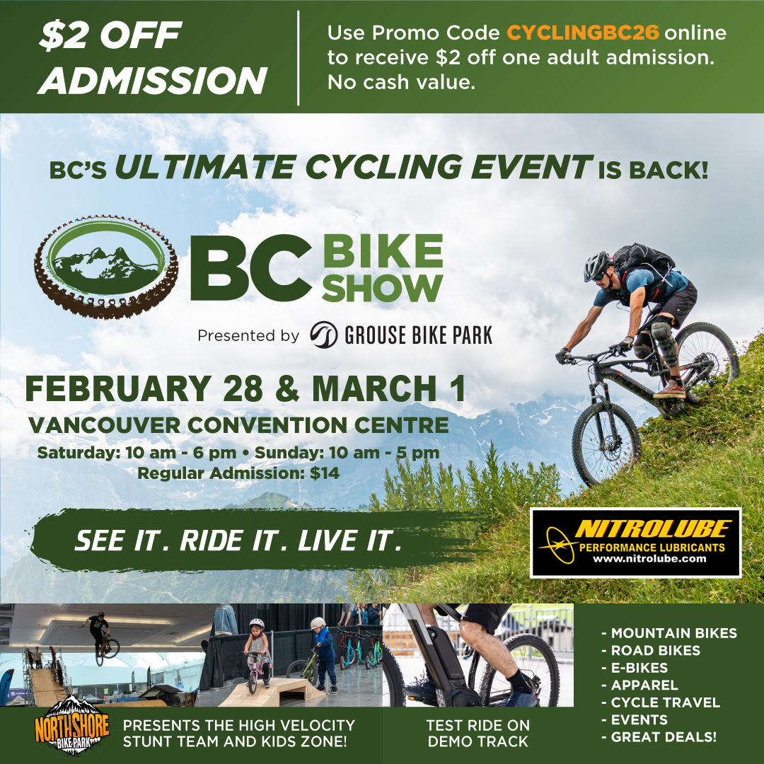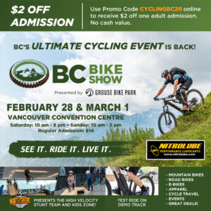2026 Cycling & Outdoor Adventure Show ……..https://www.bcbikeshow.com Are you ready for some great new products from the Cycling industry. If you like cycling and need to know and see all the New Innovations then this is the place to be. Come and see us in Booth #1520 and get an Autograph picture from a Canadian Cycling Champion ANDREW TUOVINEN `www.athleticendeavours.ca` See his Testimonial at https://www.nitrolube.com/ testimonials/ and pick up some World Class FREE NitroLube cycling Lube with a small donation to the Vancouver Children`s Hospice. Print out our DISCOUNT coupon. Save image and print.